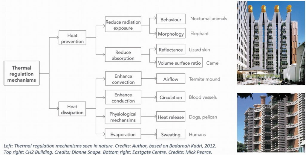 Thermally efficient building design can substantially reduce, if not eliminate altogether, reliance on air conditioning. Buildings can be designed to better withstand extreme heat by drawing on strategies evolved by organisms to survive high temperatures. ‘Biomimicry’ is the emulation of strategies seen in the living world as a basis for design. Mimicry is not direct copying but rather the interpretation and adaptation of biological functions. Architects worldwide have utilised nature-inspired strategies in buildings to maintain indoor thermal comfort and reduce space cooling loads. Notable examples include the CH2 in Melbourne, where the building envelope has been designed as a protective ‘skin’ inspired by plants, featuring a kinetic facade and openings that respond to the sun’s direction and intensity. A low-energy stack ventilation system cools the office spaces during the day, and an integrated passive ventilation system flushes out accumulated heat at night, capitalising on the diurnal temperature swings to drive air movement. The Eastgate Centre in Zimbabwe is another example, where the building’s ventilation system is derived from wind tunnels found in termite mounds that vent out heat. A high thermal mass and self-shading exterior further prevent excessive heat gain, inspired by cacti’s skin.